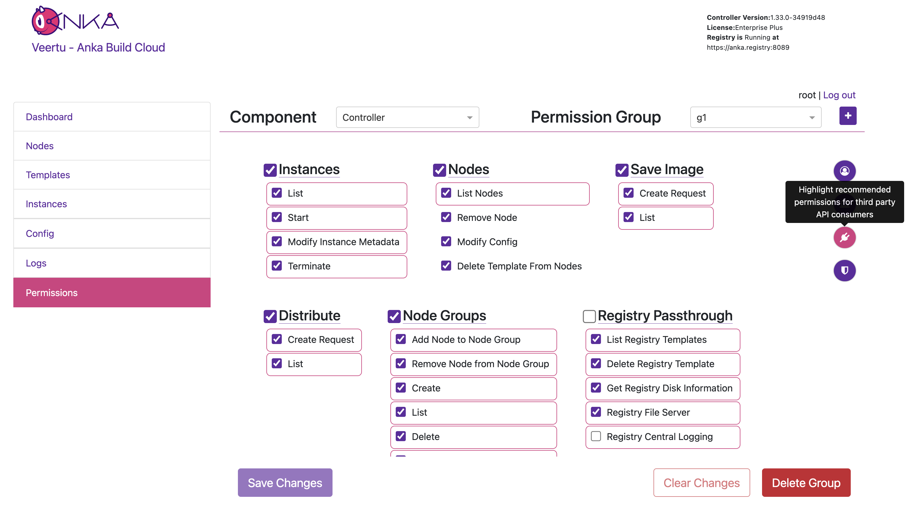 The previous admin/ui page has been replaced with a new /#/permission-groups location on the Controller, visible from the dashboard when logged in to a user with appropriate permissions to manage. There are also helper button on the right which will highlight the recommended permissions to add for the specific use-case you have (Node communication, API clients, etc).
