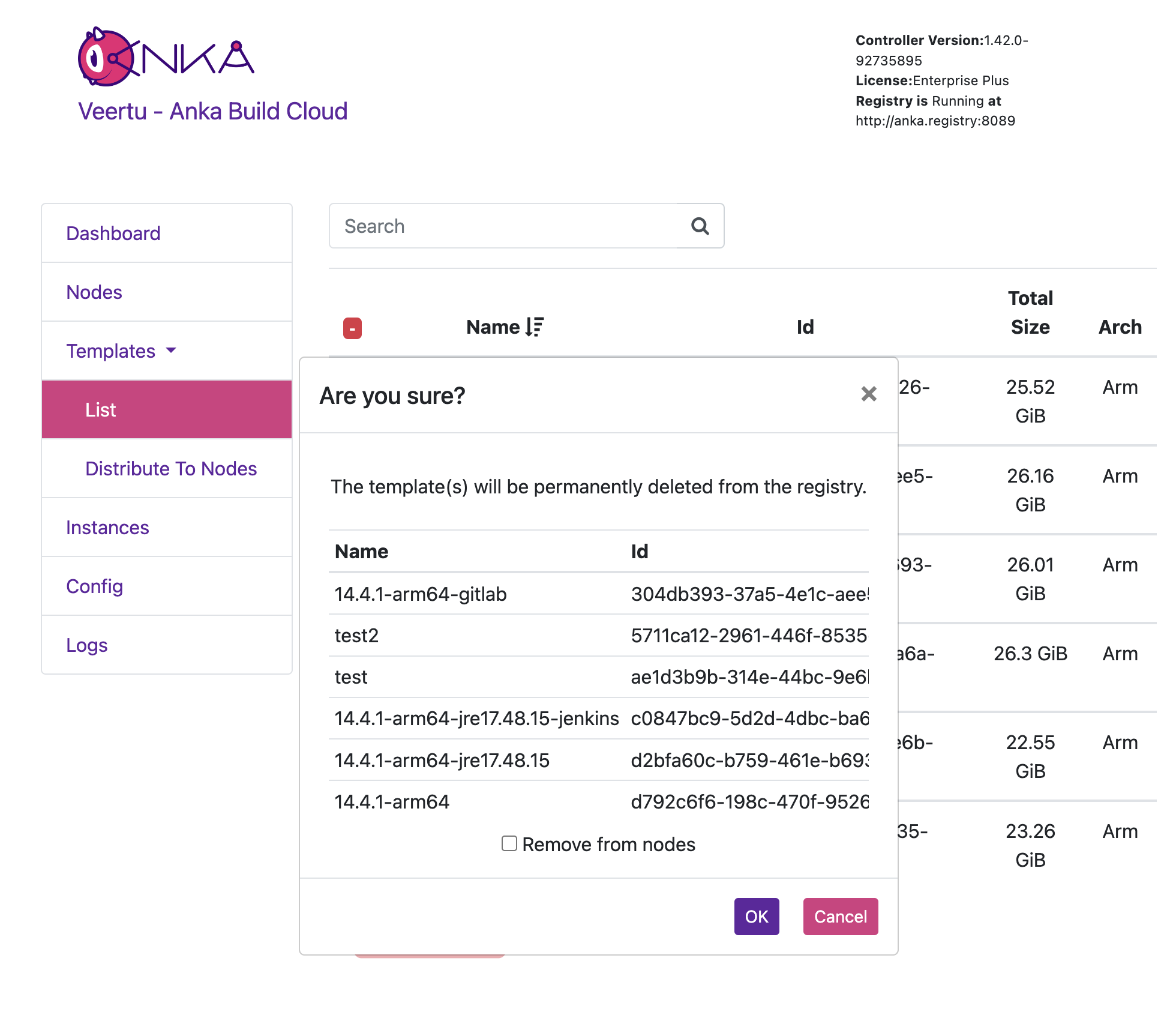 New dialogue showing table/list of templates being deleted